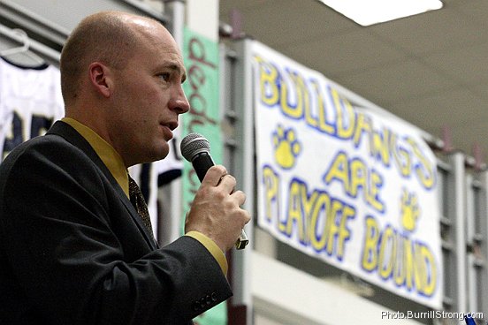 Chelsea coach Brad Bush speaks to football families at the football banquet. Though originally intended to be a year-end banquet, its advance scheduling placed it the evening before the Bulldogs’ third-round playoff game against Fowlerville.