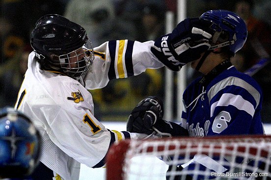 Chelsea’s David Maveal engages in a mild disagreement with a Lansing Catholic Central player. Chelsea won, 8-1.