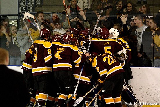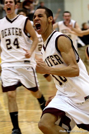 The first picture shows the Dexter hockey team celebrating in front of its student section; the second shows Chelsea’s Mike Bazydlo reacting to the loss. The third shows Dexter’s Johnny Benjamin celebrating his last-second game-winning shot; the fourth shows Chelsea’s Adam Connell mourning the loss.