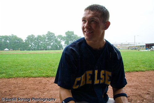 Chelsea shortstop Adam Connell smiles during a rain delay Saturday. He had good reason to smile; when thunder interrupted the game, Chelsea had a 4-0 lead over Lumen Christi.