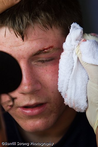 Prior to Saturday’s game against Lumen Christi, Chelsea’s Rodney Ostrowski receives treatment after losing an argument with a ground ball that took a bad hop during Chelsea’s infield warmup. He received stitches to close the cut.